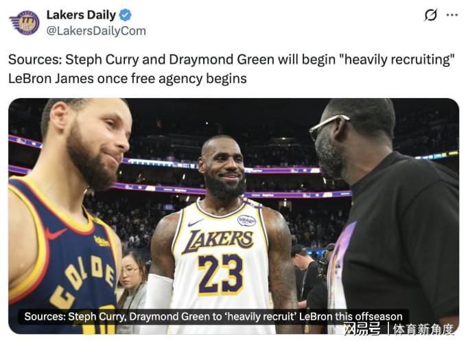 今日,美国知名体育媒体Lakers Daily发布了一篇重磅文章,其标题醒目地写着《斯蒂芬·库里与德雷蒙德·格林,自由球员市场大门开启后,将全力向勒布朗·詹姆斯发起招募攻势》。下面,就让我们一同深入解读这篇文章的详细内容。